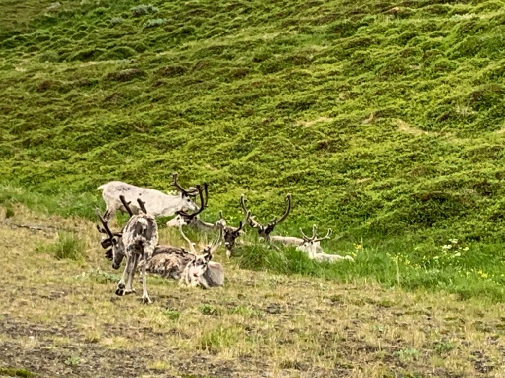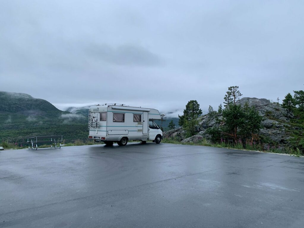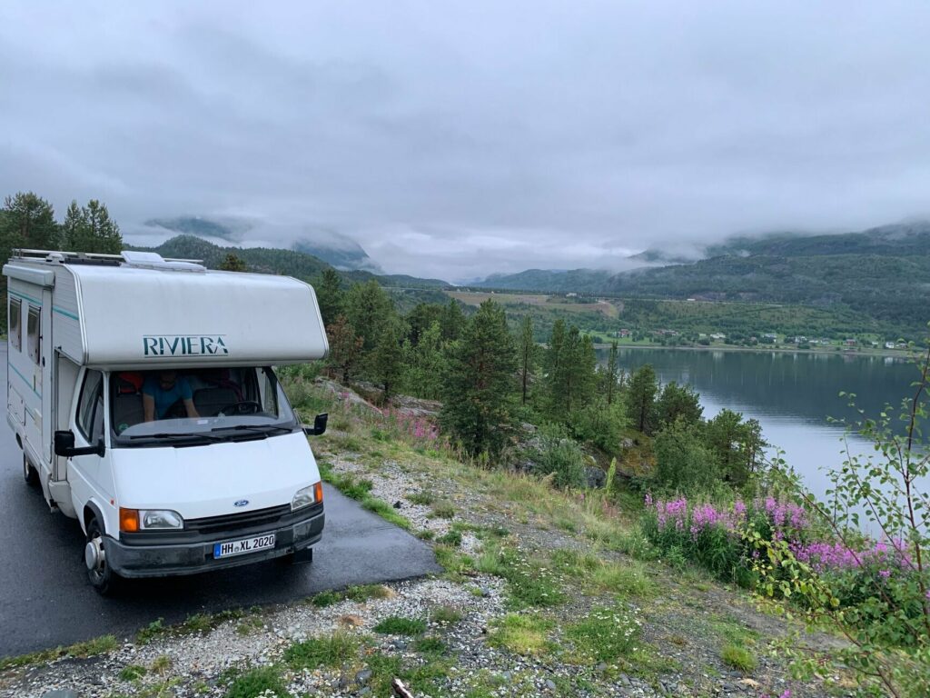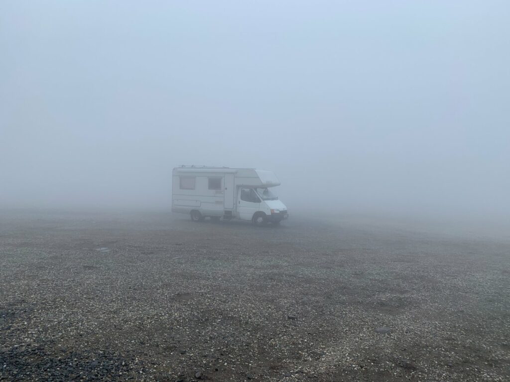 Wir starten mit Nebel in den Tag und bemerken mal wieder was für ein Glück wir hatten gestern angekommen zu sein. So kann das Nordkap auch aussehen, naja „sehen“ eigentlich nicht. Wir setzen unsere Fahrt langsam fort, leider fahren wir jetzt lange die selbe Strecke. Wir treffen wieder entspannte Rentier-Herden am Straßenrand und den Radwanderer Fabian aus Rostock. Unser Radwander-Herz schlägt höher. Er ist bereits seit 6 Wochen unterwegs über Schweden und Finnland, hat bereits 3500 km zurück gelegt und zeltet alleine in der Wildnis. Er will heute am Nordkap ankommen -Respekt-. Wir spendieren ihm noch eine Warnweste, denn die Sicht oben beträgt, wegen des Nebels, weniger als 5 Meter. Unser Nachtplatz präsentiert sich mit wunderschönen Blick auf den Kvaenvika Fjord. Leider wird unserer Schlaf durch einen lauten Parkplatz-Besucher gestört.