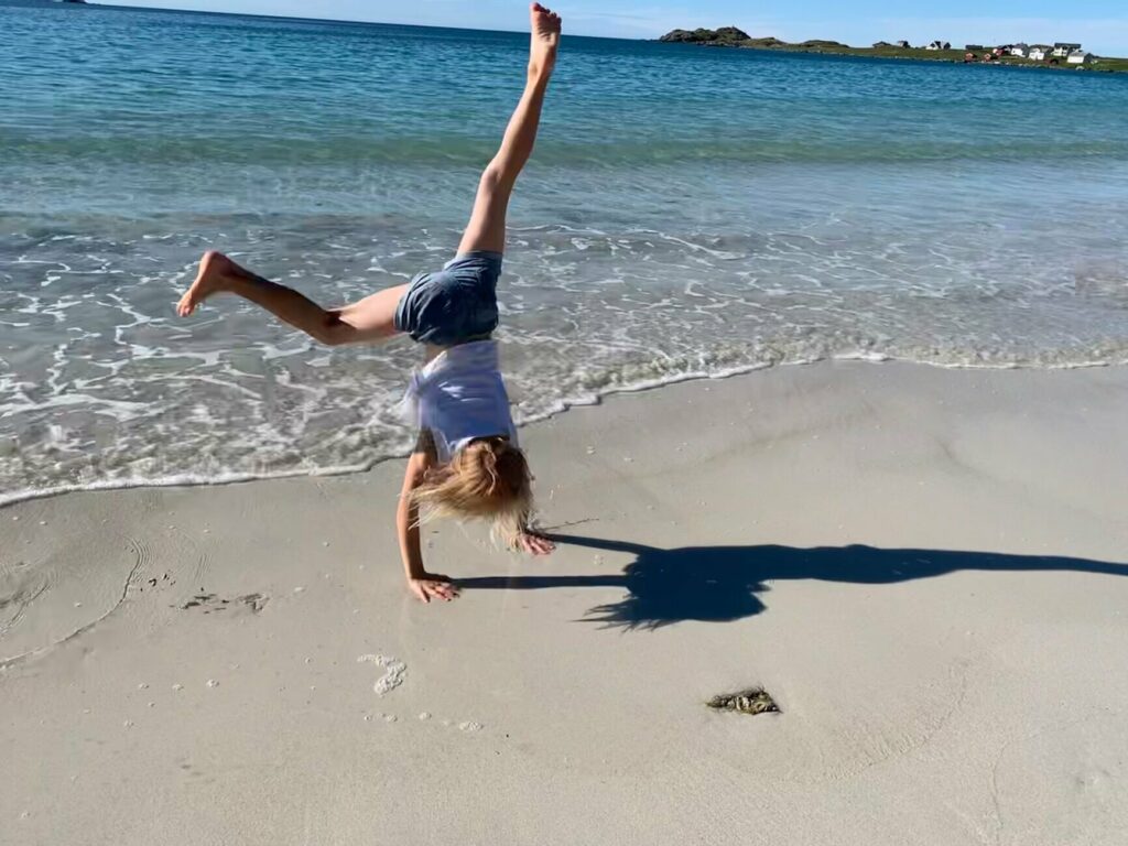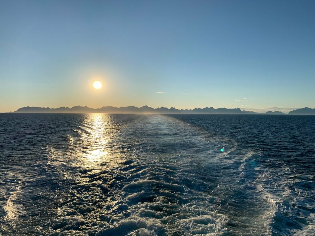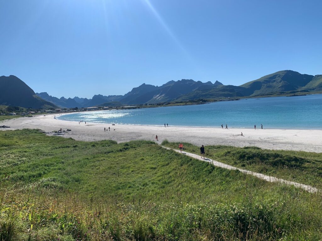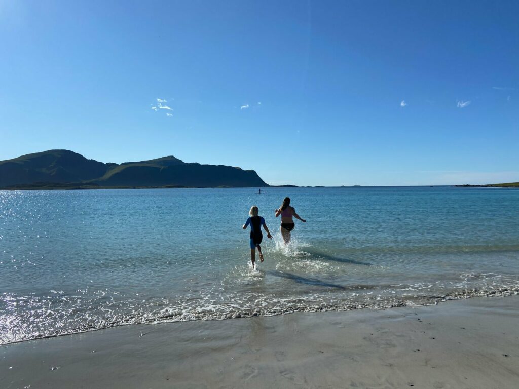 Wir besichtigen das Museeumsdorf Nusfjord. Es liegt inmitten der Bergen. Das Wasser ist türkis und klar bis zum Grund. Die Fischerhäuschen sind auf Stelzen gebaut, der Kabeljau hängt getrocknet als Stockfisch an den Holzgestellen. Im Anschluss kaufen wir noch „Teilchen“ und Brot, frischgebacken in der Bäckerei von anno 1877. Die Sonne scheint, der Himmel ist blau. Es verschlägt uns nach Ramberg, denn das schöne Wetter und der lange weisse Sandstrand lädt zum Verweilen ein. Nach einem Spaziergang, einschließe ich mich endlich mal wieder zu joggen, auch wenn keine Dusche in der Nähe ist. Aber vielleicht werde ich warm genug, um mich danach in den eiskalten Fjord zu wagen. Lotta und Paula begleiten mich ein Stück und beim Baden ist Lotta auch mutig genug. Nun können wir sagen: „Wir haben in der Arktis gebadet“. Leider müssen wir weiter, denn wir wollen die Fähre um 20:30 Uhr nach Bodo erreichen.