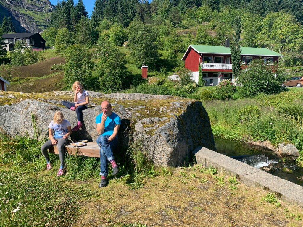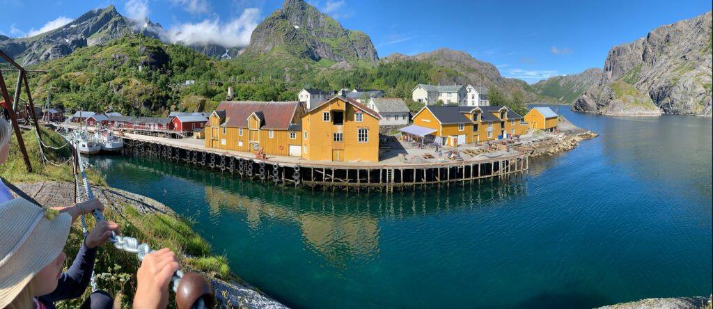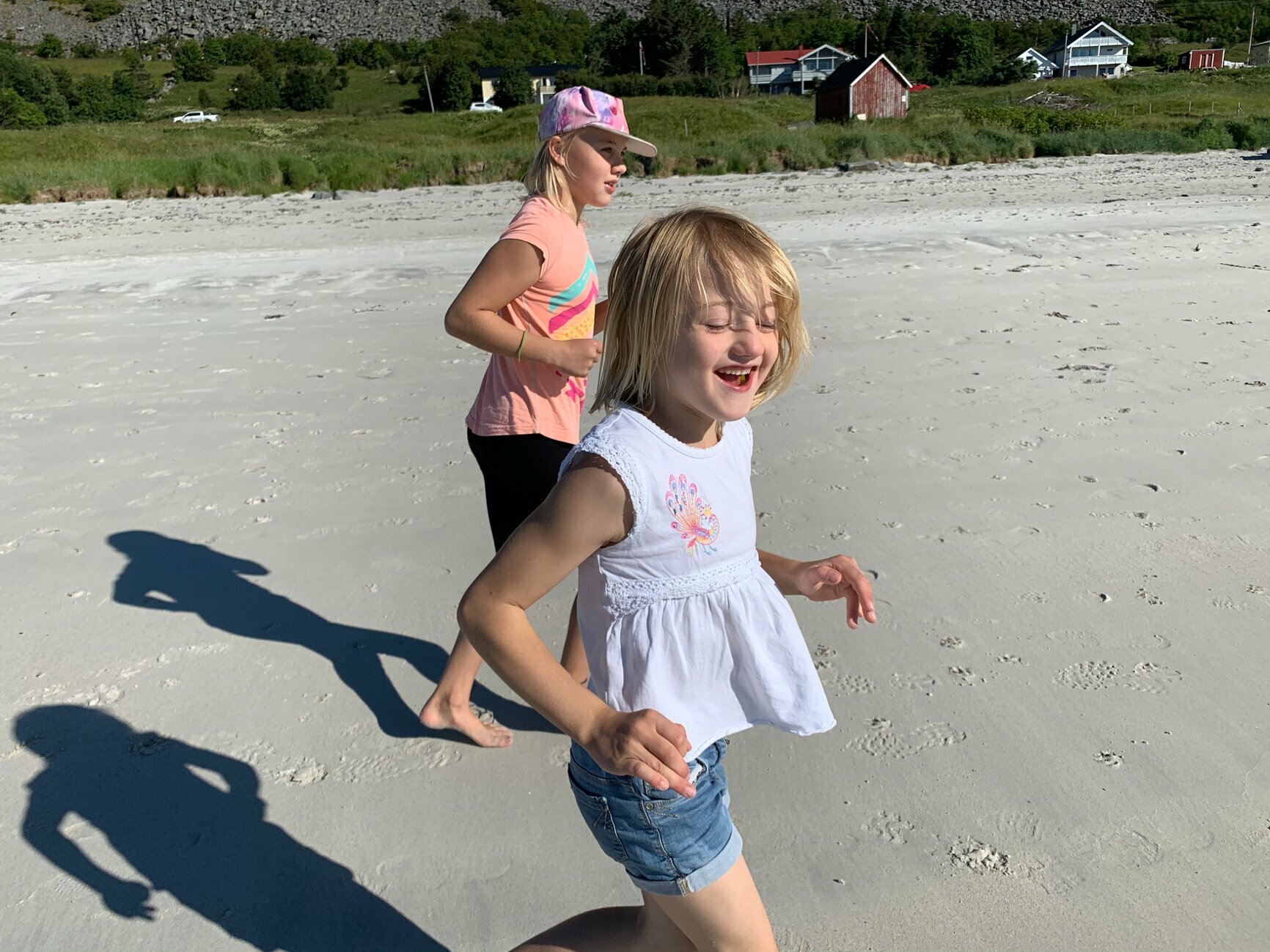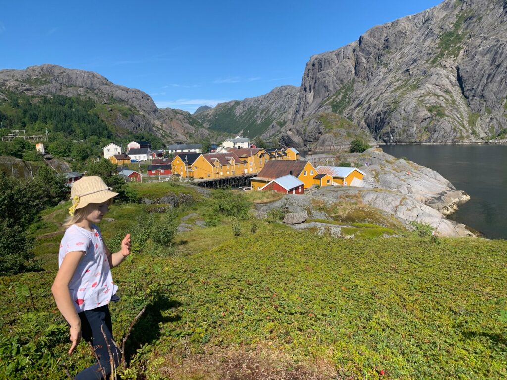 Wir besichtigen das Museeumsdorf Nusfjord. Es liegt inmitten der Bergen. Das Wasser ist türkis und klar bis zum Grund. Die Fischerhäuschen sind auf Stelzen gebaut, der Kabeljau hängt getrocknet als Stockfisch an den Holzgestellen. Im Anschluss kaufen wir noch „Teilchen“ und Brot, frischgebacken in der Bäckerei von anno 1877. Die Sonne scheint, der Himmel ist blau. Es verschlägt uns nach Ramberg, denn das schöne Wetter und der lange weisse Sandstrand lädt zum Verweilen ein. Nach einem Spaziergang, einschließe ich mich endlich mal wieder zu joggen, auch wenn keine Dusche in der Nähe ist. Aber vielleicht werde ich warm genug, um mich danach in den eiskalten Fjord zu wagen. Lotta und Paula begleiten mich ein Stück und beim Baden ist Lotta auch mutig genug. Nun können wir sagen: „Wir haben in der Arktis gebadet“. Leider müssen wir weiter, denn wir wollen die Fähre um 20:30 Uhr nach Bodo erreichen.