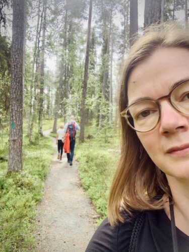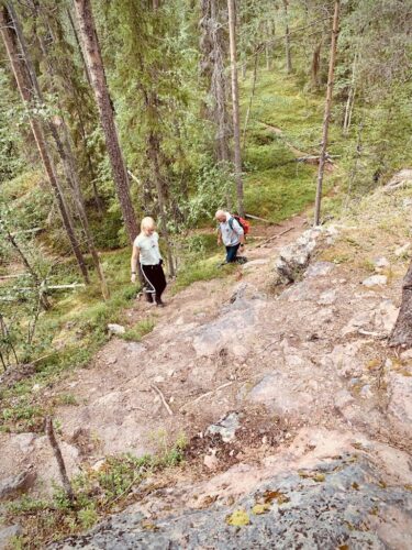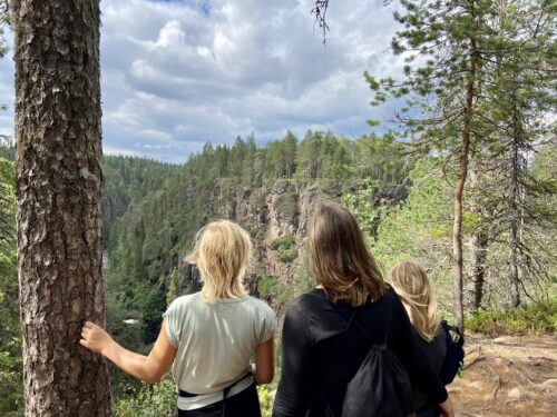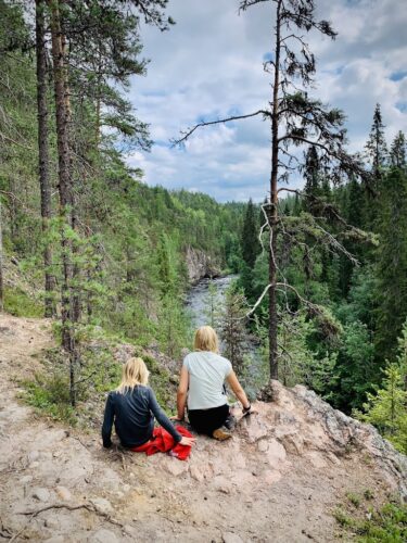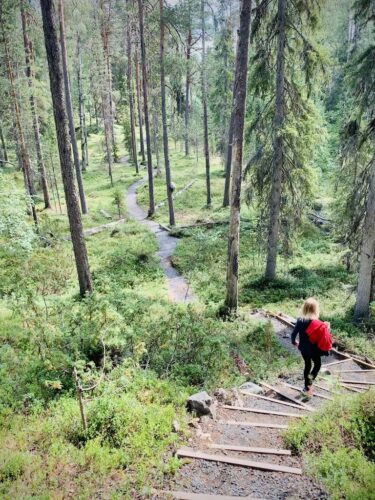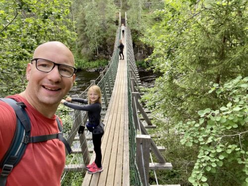 Es wird die mückenreichste Wanderung, die wir je gemacht haben. Der Trail „Kanjonin kurkkaus“ führt uns durch den finnischen Nationalpark vorbei an Seen und dem Fluss „Oulankajoki“, der durch enge canyonartige Felsdurchbrüche fließt und den wir über die Hängebrücke „Savilapi“ überqueren. Weil Paulas Füße scheinbar schon wieder gewachsen sind und ihre Schuhe drücken, gehe ich mit ihr zurück und wir kommen nach 6,3 km beim WoMI an. Die anderen beiden machen noch eine kleinen Abstecher auf der anderen Seite des Flusses und kommen nach 8 km erschöpft und zerstochen zurück.