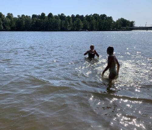 Am späten Nachmittag kehren wir zurück, um nur schnell unsere Schwimmsachen aus dem kochendem Fahrzeug zu holen und uns am Strand der Insel noch etwas abzukühlen im Wasser und im Schatten!