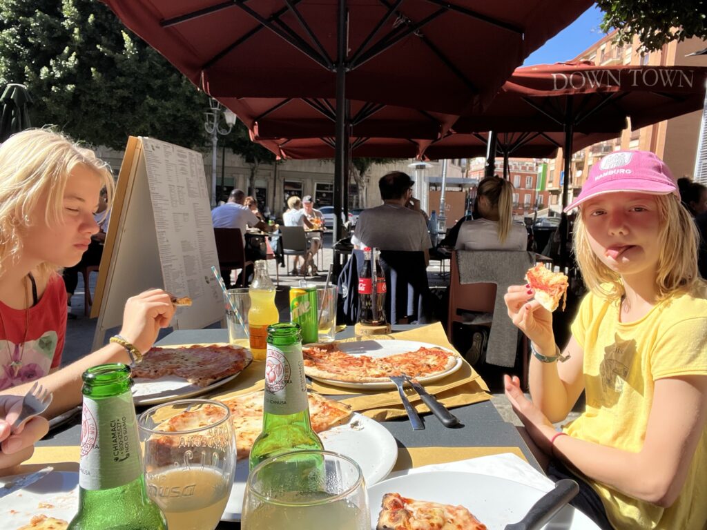 Direkt im Anschluss lassen wir uns (leider in der heissen Sonne) echte sardinische Pizza schmecken auf der „Piazza Yenne“. Es geht doch nichts darüber, den Nachtisch vor dem Hauptgang zu genießen.