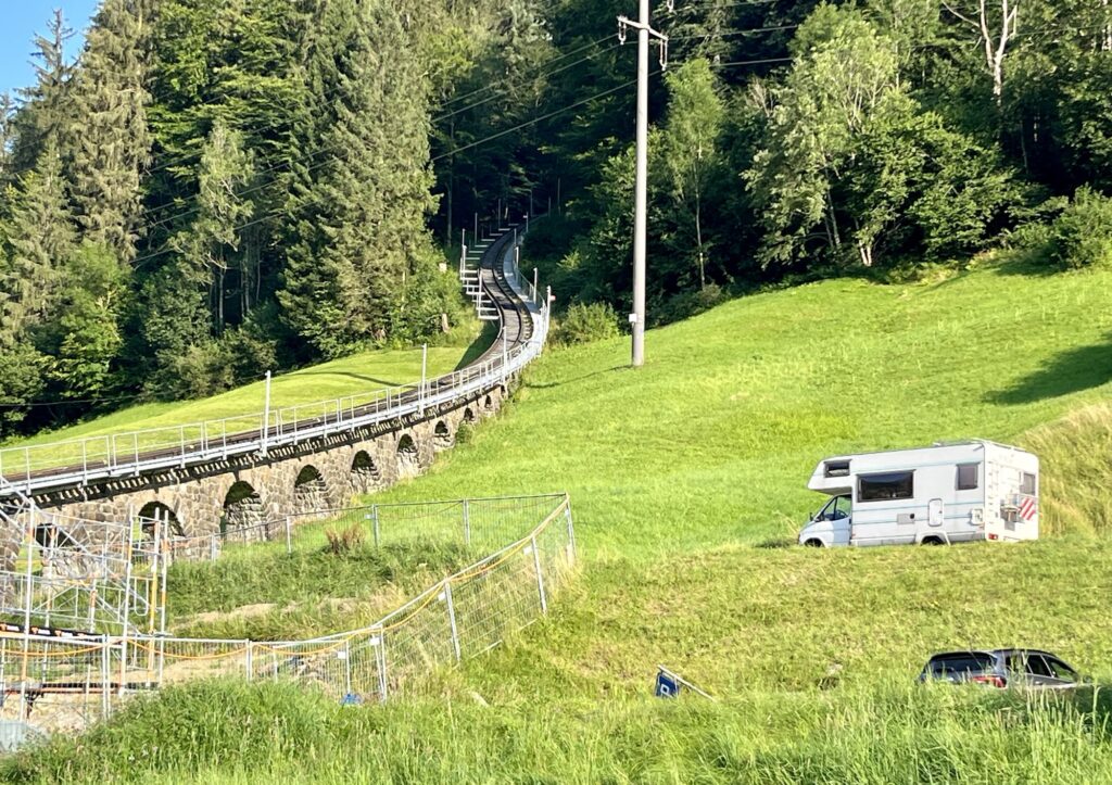 Der Stellplatz verspricht für alle etwas zu bieten Wanderung und Freibad und wie sich raus stellt, achtet niemand darauf, dass wir hier auch übernachten, da an der Talstation Unterwasser der Standbahn gebaut wird. Eigentlich sollte es 25,- CHF kosten.