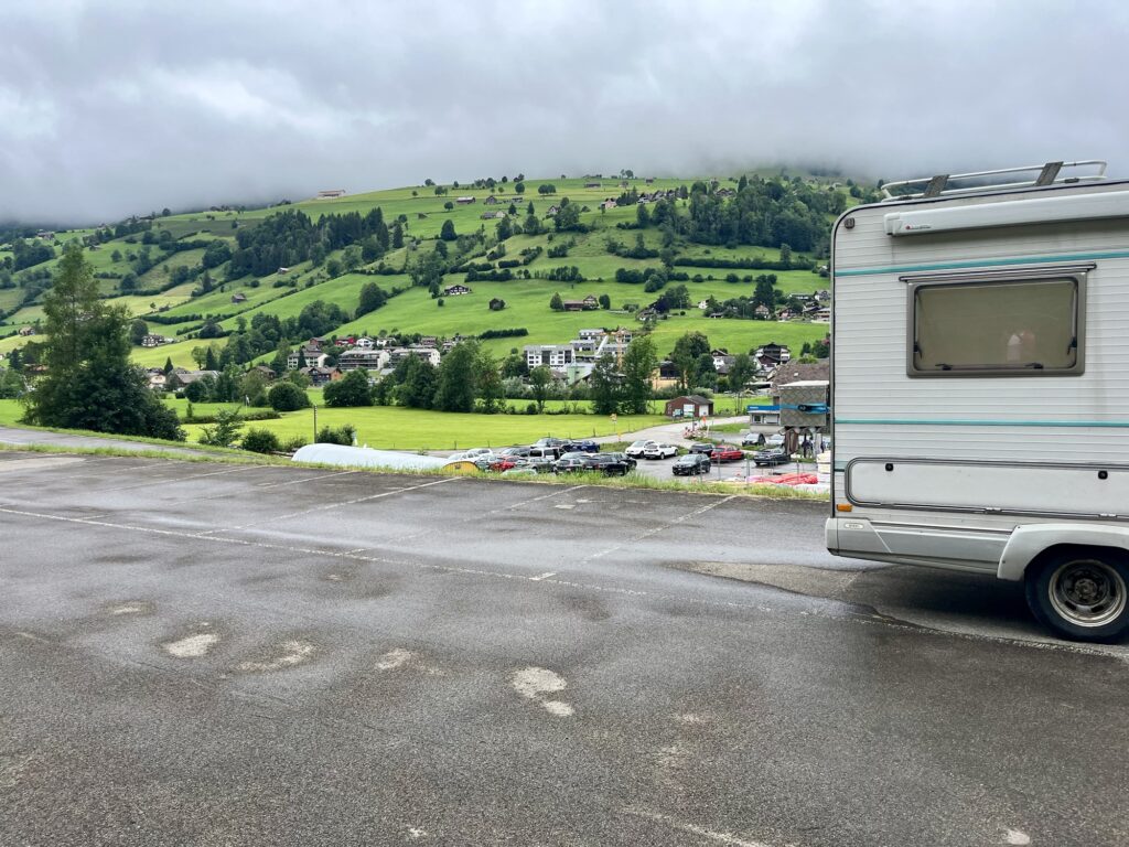 Die Aussicht ist schön, aber die Parklücke ein bissl zu knapp für uns und leider ist der Platz doch recht frequentiert. Gegen 22 Uhr halten insgesamt 3 Reisebusse mit Jugendlichen, die eine lange Schlangen vor dem Toilettenhäuschen bilden und auf dem Parkplatz tanzen, während wir im WoMi „Die haarsträubenden Fälle des Philip Maloney“ hören, eine Hörspielserie, die wir im Schweizer Radio entdeckt haben.