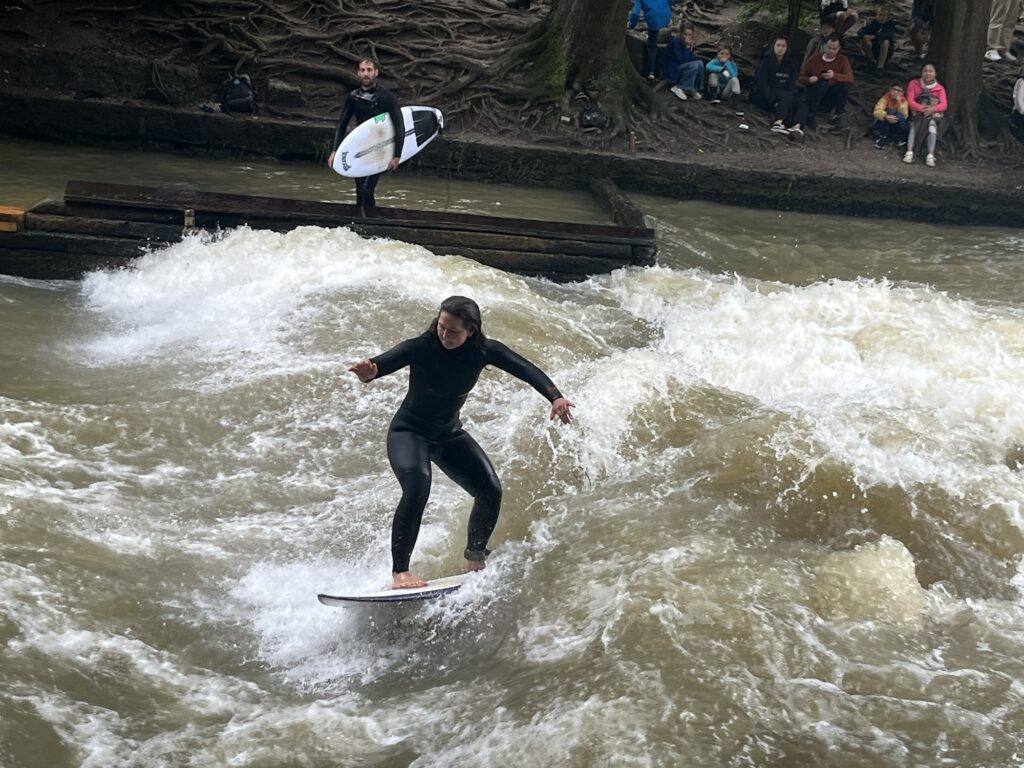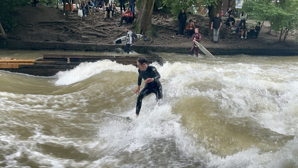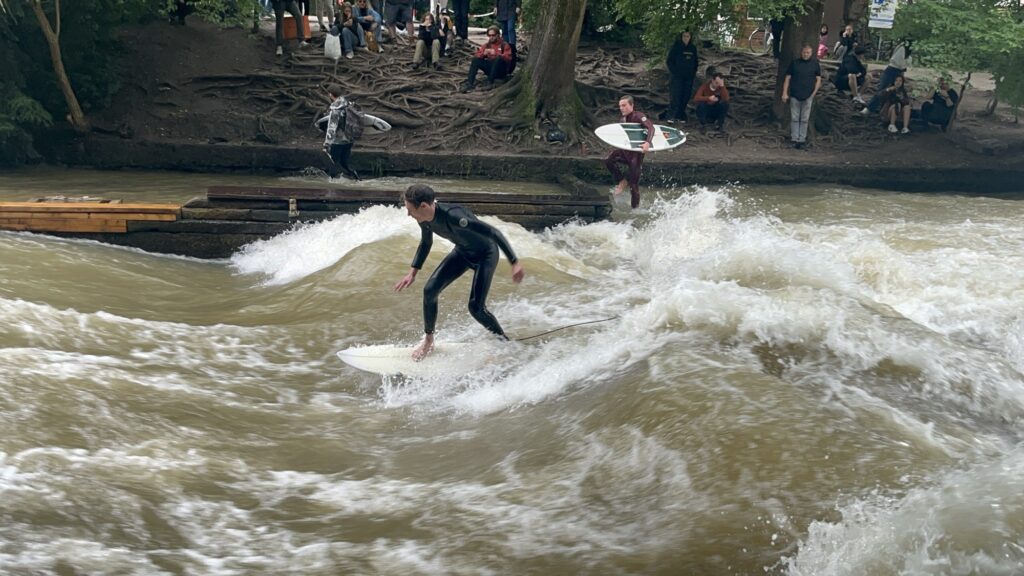 Wir machen noch einen Abstecher zur Eisbachwelle, wo die Surfer auf einer künstlich angelegten stehende Welle ihre Künste zeigen.