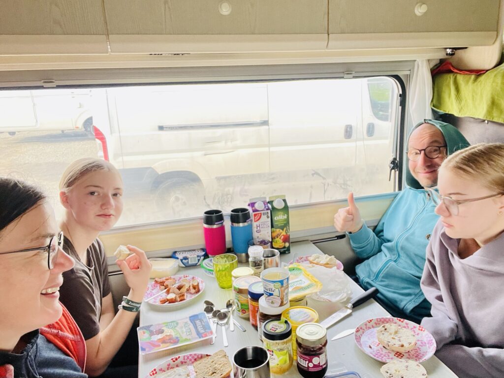 Wir haben die erste kalte Nacht hinter uns gebracht. Am Morgen liegt die Temperatur bei 8 Grad im WoMi.