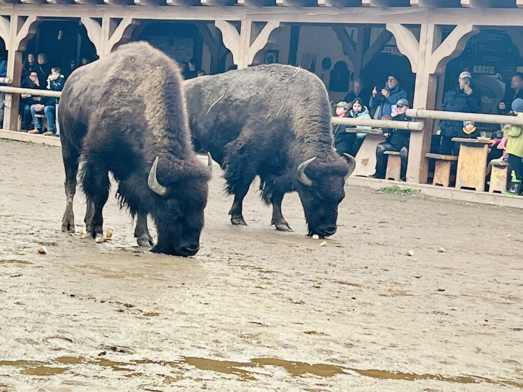 Heute wird es wild im Wilden Westen mitten im Harz – Pullman City. Es ist ein Mix aus Freilichtmuseum und Mittelaltermarkt, halt nur im Wilden Westen Amerikas. Es gibt Shows mit Pferden, Feuer und Falken und natürlich mit Indianern, Cowboys und Cowgirls und sogar mit Bisons und Longhorns. Wir sehen Kutschen, Saloons, Sheriffs-Büro, typische Western-Häusern und Tipis, in den man übernachten kann oder die von den Schaustellern der Western-Stadt bewohnt werden.